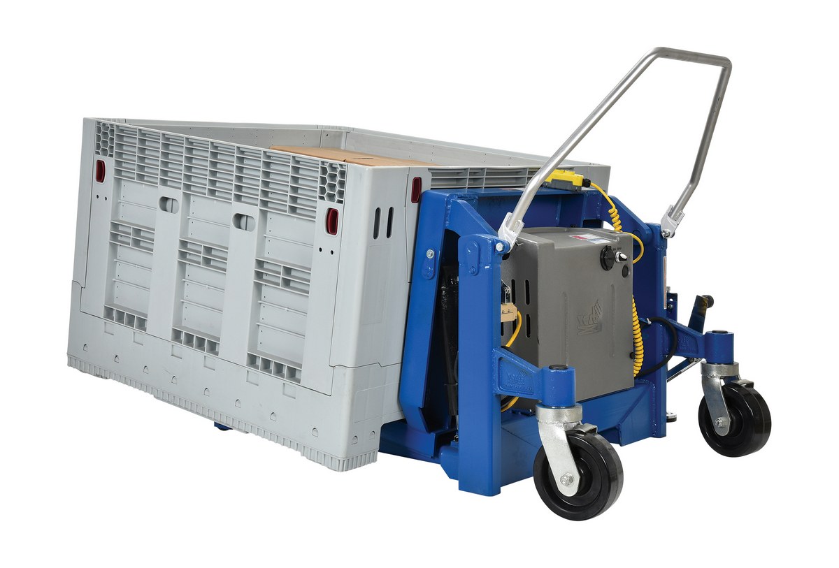 Steel Tilt Master AC Powered 4,000 Lb. Capacity BlueThe tilt master lifts and positions filled tote boxes or baskets without the need of a fork truck or lift table using the newly designed heavy-duty tilt master. The tilter will function as transporters by moving completed products from work station to work station without waiting for a fork truck. The lift has a thin profile to allow the user to get as close to the load as possible, a standard floor lock and rolls easily on the phenolic steering wheels. It is designed to be used with open bottom pallets or skids. This unit is powered by an electric AC motor.