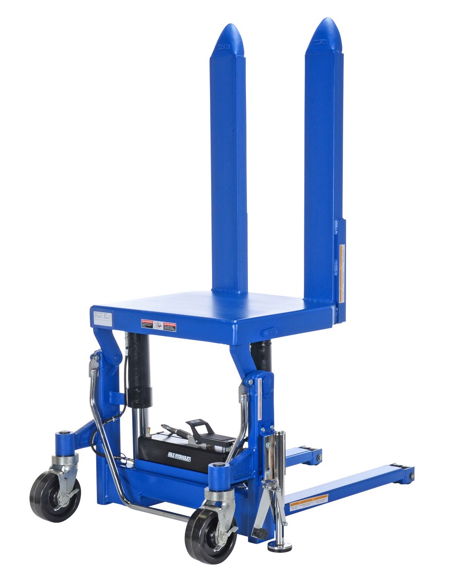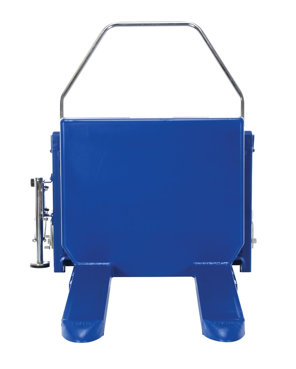 Steel Tilt Master Reciprocating Air/Oil Power 6,000 Lb. Capacity BlueThe tilt master lifts and positions filled tote boxes or baskets without the need of a fork truck or lift table using the newly designed heavy-duty tilt master. The tilter will function as transporters by moving completed products from work station to work station without waiting for a fork truck. The lift has a thin profile to allow the user to get as close to the load as possible, a standard floor lock and rolls easily on the phenolic steering wheels. It is designed to be used with open bottom pallets or skids. The unit is powered by an air pneumatic motor.