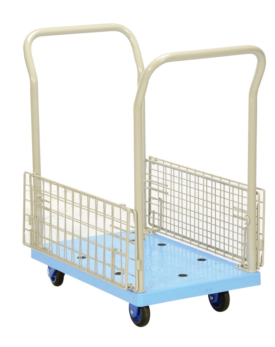 Plastic Truck Mesh Sides 32-1/2 In. x 19-1/4 In. x 34 In. 330 Lb. Capacity BlueThe plastic platform cart is a great addition to the shipping and distributing facilities. The plastic platform creates a durable, yet lightweight construction that can be transferred simply from workstation to workstation. The unit rolls on casters for smooth transference over a variety of terrains, while the side nets enable the utmost security. The attached handle creates a more ergonomic posture of personnel during use.