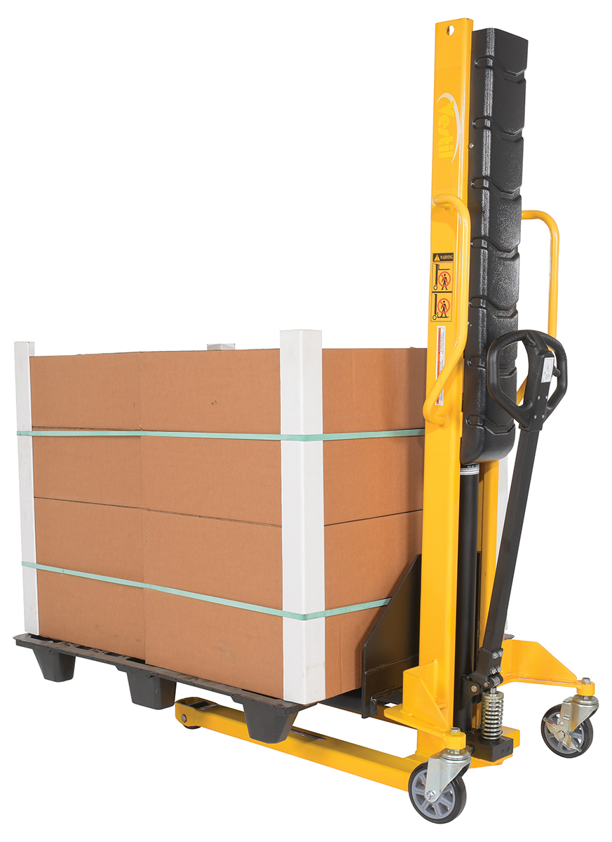 Steel Manual Stacker Narrow Mast Fixed Forks/Legs 1,000 Lb. Capacity Black / YellowSturdy and compact to fit through standard doors. Forks are raised by manual hydraulic hand pump operation and released by a lever situated on the handle. 1" lift per handle pump. Two rigid and two swivel wheels standard.