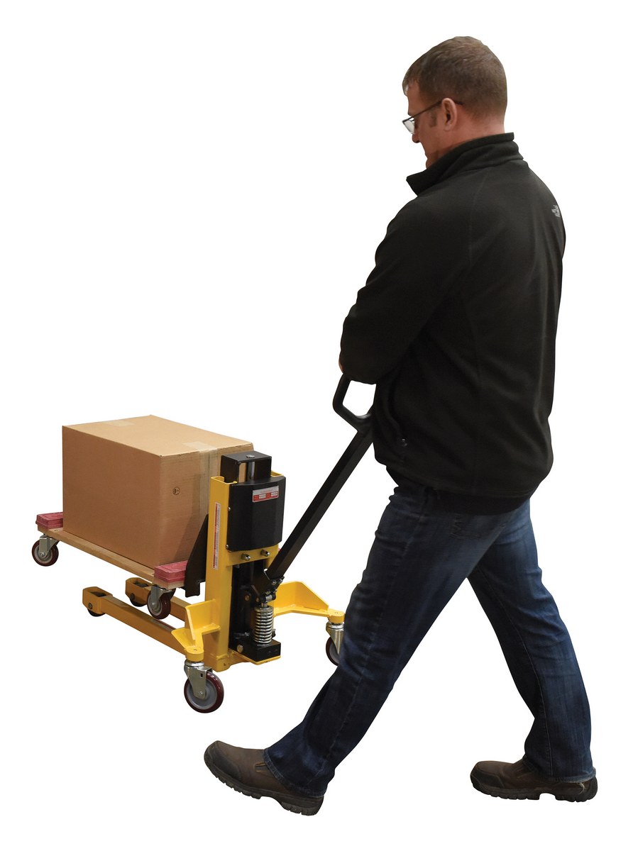 Steel Single Fork Skid Positioner Lifter 800 Lb. Capacity Yellow / BlackA single fork skid positioner lifter is a new design of an old classic. Instead of the usual two skinny forks to lift open bottom skids, crates, and baskets this model has one large centered fork. The fork is open on 3 sides for easy loading and unloading of products. The high handle not only allows for steering, but as the pumping mechanism to raise and lower the height of the fork. Unit rolls on casters and includes a foot brake for secured positioning during transition periods. The compact design takes up minimal storage space, when not in use.