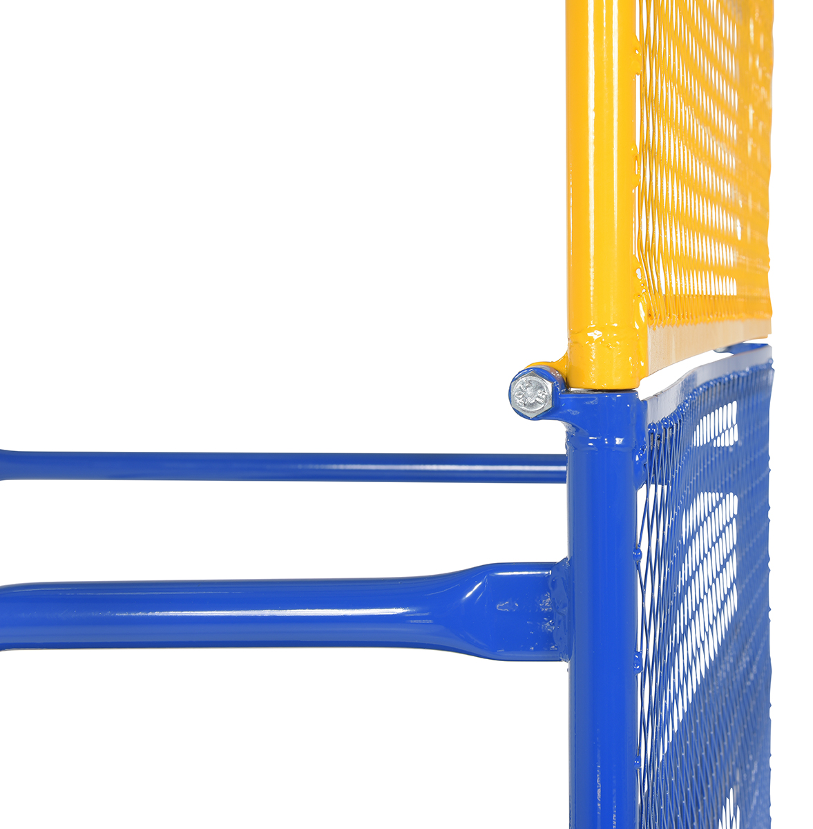 Steel Work Platform With Poly Casters and 84 In. Expanded Back 36 In. x 36 In. 1,000 Lb. Capacity BlueThis convenient fork truck work platform quickly and safely raises maintenance personnel where they are needed. Attaches to fork truck by inserting forks into fork pockets and securing platform to fork truck. Fork locks secure platform to forks. Dual handrails on three (3) sides. Expanded metal backing on fourth side. Includes checker floor plate platform and long strap with hook to attach platform to fork truck. A maximum of two (2) people can be in the work platform at one time. Includes (4) four poly swivel casters. Meets California OSHA specifications.