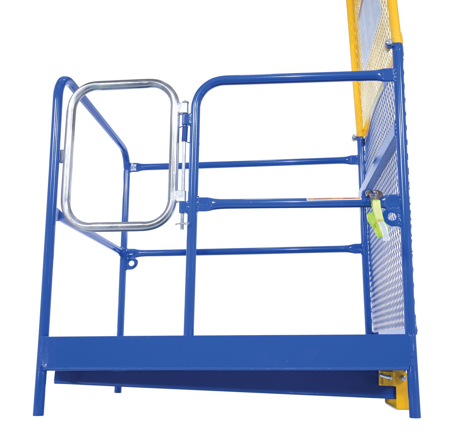 Steel Work Platform With 84 In. Expanded Back 36 In. x 48 In. 1,000 Lb. Capacity BlueThis convenient fork truck work platform quickly and safely raises maintenance personnel where they are needed. Attaches to fork truck by inserting forks into fork pockets and securing platform to fork truck. Fork locks secure platform to forks. Dual handrails on three (3) sides with expanded metal backing on the fourth side. Includes checker floor plate platform and long strap with hook to attach platform to fork truck. A maximum of two (2) people can be in the work platform at one time. Meets California OSHA specifications.