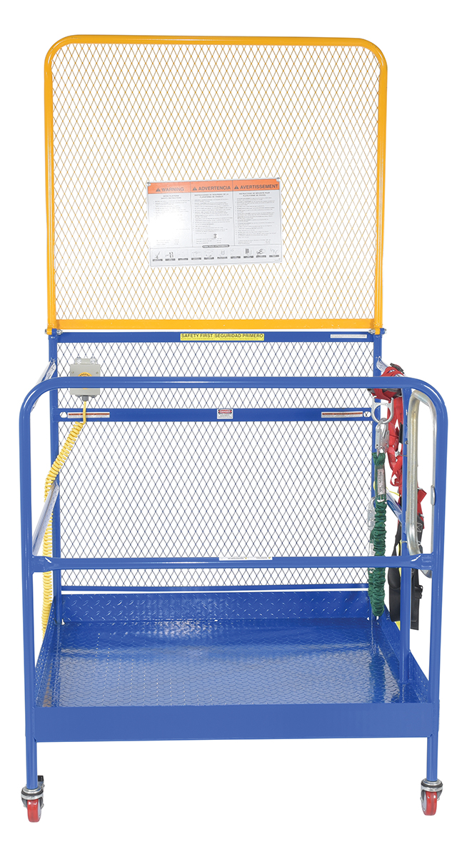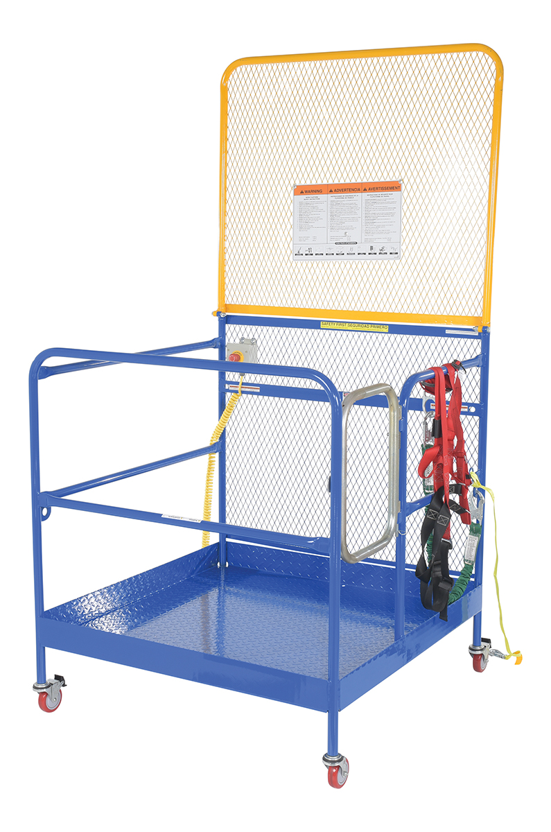 Steel Full Featured Work Platform With Poly Casters and 84 In. Expanded Back 48 In. x 48 In. 1,000 Lb. Capacity BlueThis convenient fork truck work platform quickly and safely raises maintenance personnel where they are needed. Attaches to fork truck by inserting forks into fork pockets and securing platform to fork truck. Fork locks secure platform to forks. Dual handrails on three (3) sides with expanded metal backing on the fourth side. Includes checker floor plate platform and long strap with hook to attach platform to fork truck. A maximum of two (2) people can be in the work platform at one time. The full featured units include an emergency stop button kit and web lanyard with XL safety harness. Alternate size harnesses available upon request, S-XL (XXL & XXXL available at an additional charge).