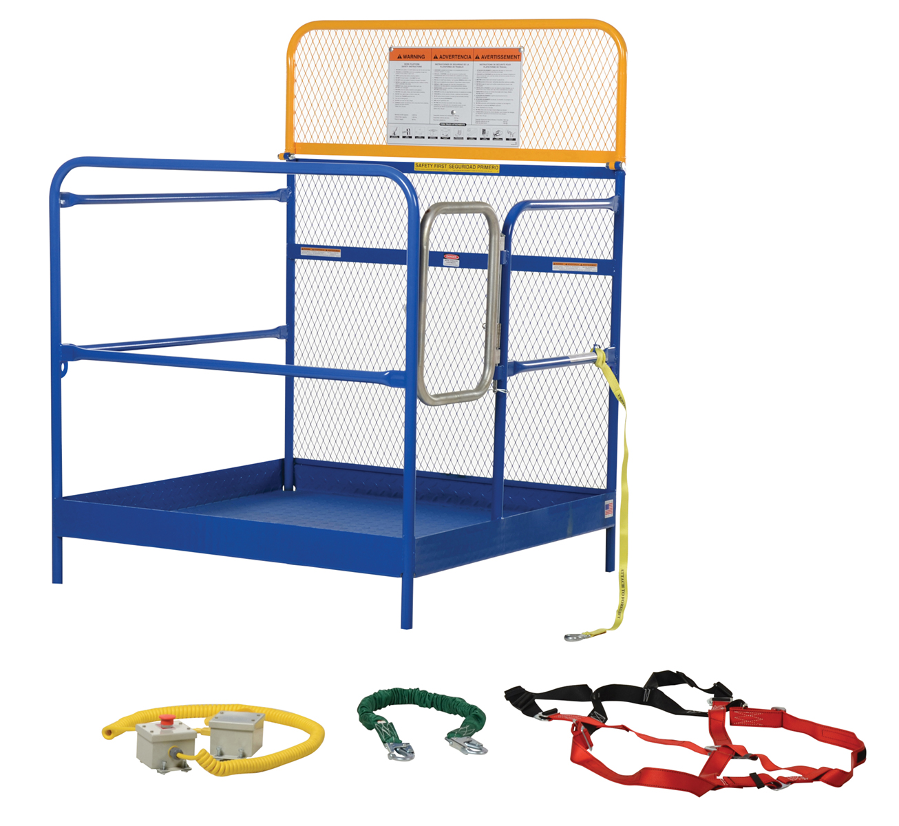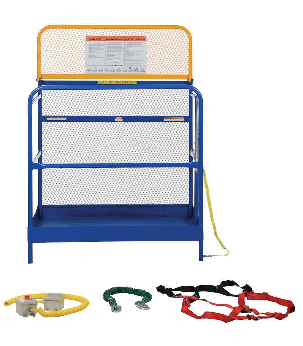 Steel Full Featured Work Platform 48 In. x 48 In. 1,000 Lb. Capacity BlueThis convenient fork truck work platform quickly and safely raises maintenance personnel where they are needed. Attaches to fork truck by inserting forks into fork pockets and securing platform to fork truck. Fork locks secure platform to forks. Dual handrails on three (3) sides with expanded metal backing on the fourth side. Includes checker floor plate platform and long strap with hook to attach platform to fork truck. A maximum of two (2) people can be in the work platform at one time. The full featured units include an emergency stop button kit and web lanyard with XL safety harness. Alternate size harnesses available upon request, S-XL (XXL & XXXL available at an additional charge).