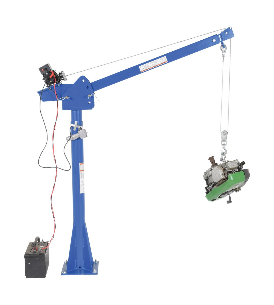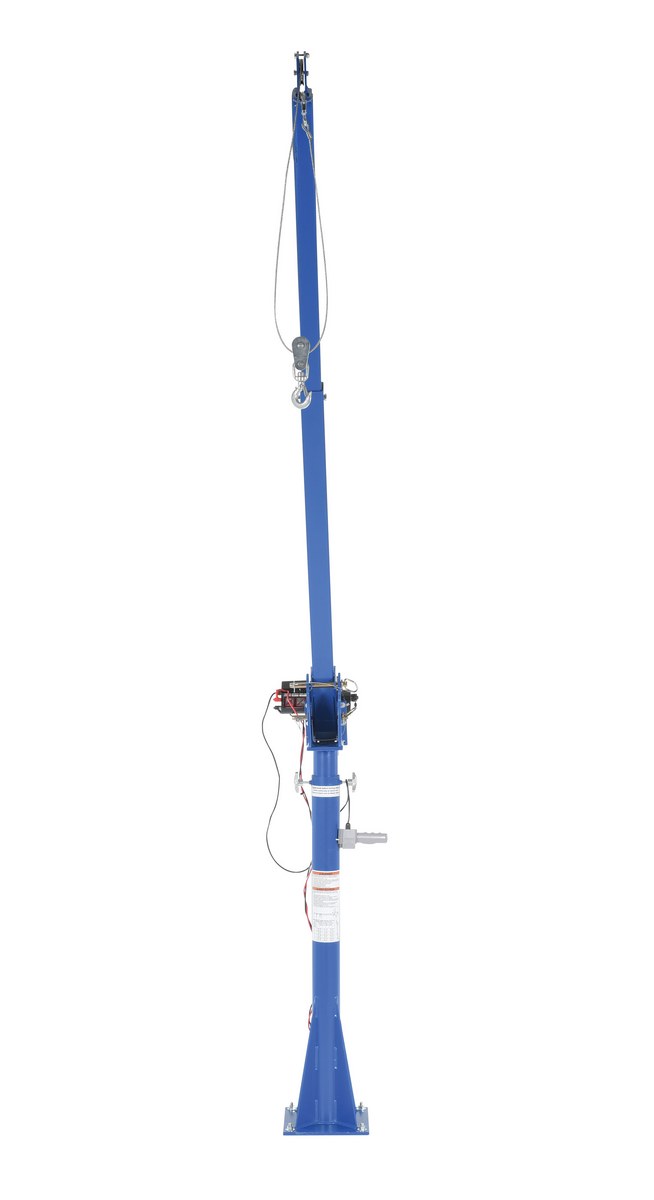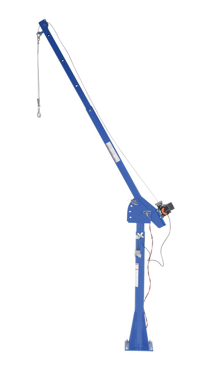 Steel DC Powered Jib Crane 4-7 Ft. Boom 2,000 Lb. Capacity BlueA power lift Jib crane is designed for material handling applications on docks, in warehouses or in truck beds. This intermittent unit uses crane feature rotation hand brakes that offer unlimited positioning. The mast mounts permanently. Boom adjusts in one (1) foot increments and can be positioned at four (4) elevations. Folds for storage. Unit is designed for vertical lifting only. Do not use unit for lifting personnel or overhead lifting.